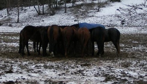 Det stora problemet är nog egentligen att de har mat i hagen och tydligen också vatten någonstans, så de har alltså ingen bra anledning att gå in. Eftersom flocken består av 10 hästar så vill jag inte ta bort maten ur hagen då det innebär en väldigt stor ökning av arbetet med att släpa hö. Jag får alltså välja mellan hösläpande och hästsläpande...