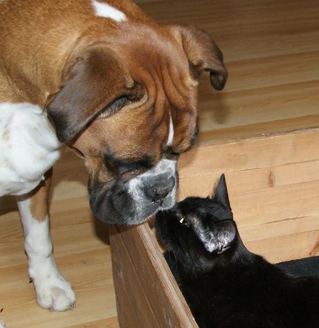 Kissen har nu funnit sig helt i sin nya roll som mor och visar stolt upp sina barn för alla som vill titta på dem. Hundarna fick hålla sig på behörigt avstånd igår men idag så lyckades Ida smyga in när jag inte såg. Nu gick det bra som tur var och till min stora förvåning så verkar Kissen inte tycka att det var så farligt att ha en stor boxernos i sin låda. Ida har ända sedan Kissen kom som liten unge ansett att hon är hennes katt och nu är hon helt fascinerad över sina nya små katter som hon siktar på att hjälpa till att uppfostra till riktiga hundar. Det är ju ingen större skillnad på nyfödda katter och hundar och med rätt uppfostran så kan man, enligt Ida, lära om dem så att de tror att de är boxrar. Tänk vilken lycka att ha massor av roliga små boxrar att leka med hela tiden...