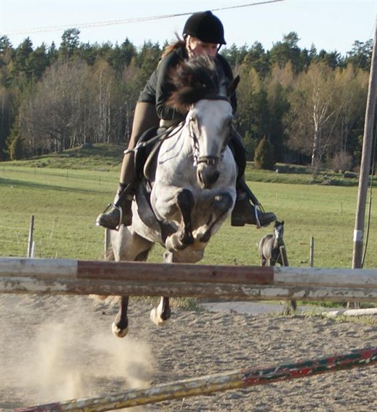 Även Joop fick komma ut och visa upp sig under ryttare. Han har ju inte gjort så många knop på senaste tiden men när han kom in i ridhuset och fick syn på publiken så blev han som ung på nytt. Han har mest hasat runt lite oengagerat när vi har tränat men nu sprätte han runt som en unghäst och det var knappt att Amanda fick hejd på honom. Att han kan hoppa har han visat även på träning men nu fullkomligt flög han över hindren, spänstigare artonåring får man nog leta efter...