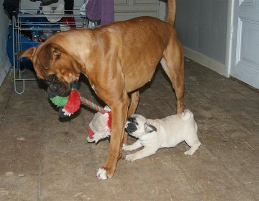 Lilla Kajsa har anpassat sig otroligt bra till livet i boxerflocken, hon är tom ute i stallet och springer lite på dagarna. Hennes största idol är Astrid och man ser ganska ofta en stor brun hund följd av en liten gul som travar omkring och letar efter tuggbara saker. Hon har också utvecklat en förkärlek för att försöka fånga boxersvansar, dessa viftar ju konstant och är precis lagom tjocka för att en liten mops ska kunna få ett bra grepp om dem. Ägarna till dessa svansar är inte odelat positiva till denna lek men har lärt sig att höja svansen till en sådan nivå att mopsen inte når den. Dragkamp är också en uppskattad lek som faktiskt både Astrid och Kajsa tycker är lika roligt.